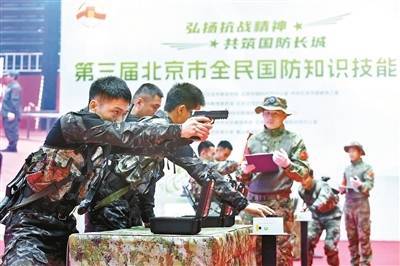r作为今年“全民国防教育月”中的重要活动之一,本次大赛吸引了全市16区和38所在京高校组队参加。经过初赛角逐,12支代表队入围决赛。决赛分技能决赛、知识竞赛两部分。技能决赛的赛场上,选手们需要依次完成侧身匍匐通过战术网、翻越坡度墙障碍、战场救护、横渡云梯、手枪激光模拟射击共5个项目,各队队员都通力配合、全力以赴,把平时训练的技能充分展示在赛场上。